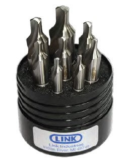 METRIC 90° SCREW UNIDAPT COUNTERSINK SET 7 PC SET, Made from M-2 HSS, designed for drilling and countersinking flat head and oval head screws. 82° for English and 90° for Metric screws. These tools have a tapered shank that require a LINK Unidapt Holder.