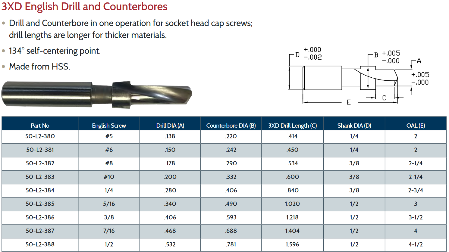 3/8 ENGLISH 3XD HSS DRILL & COUNTERBORE,DRILL DIA .406 X 1.218, CBORE DIA .593, SHANK DIA 1/2, OAL 3-1/2, M-2 HSS, UNCOATED