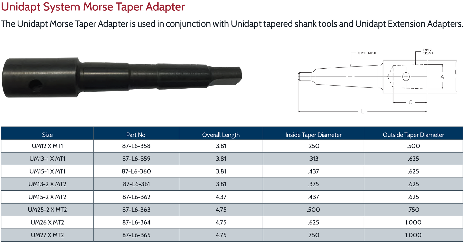 The Unidapt Morse Taper Adapter is used in conjunction with Unidapt tapered shank tools and Unidapt Extension Adapters.
